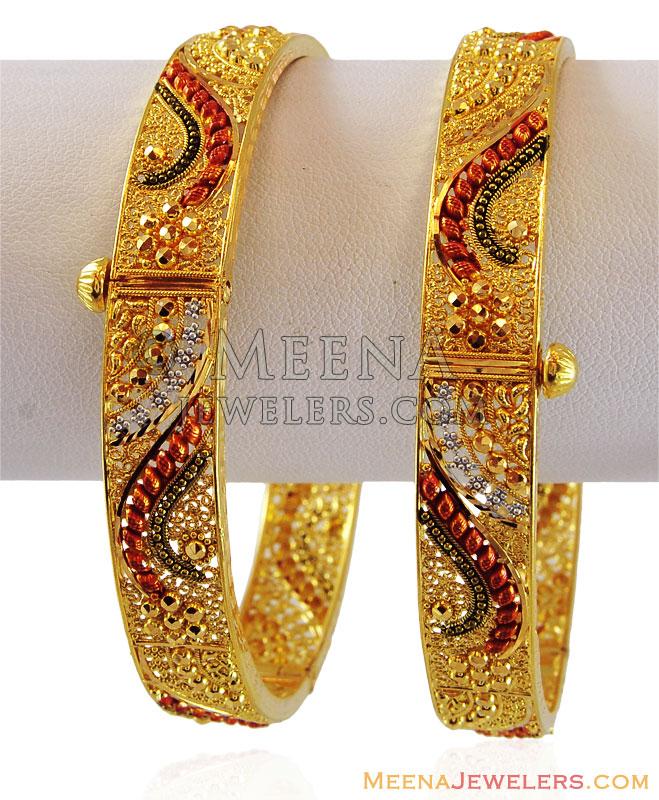 22k gold kadas (2pc) designed with traditional filigree work, machine cuts and diamond cuts in combination with beautiful Three tone color work.