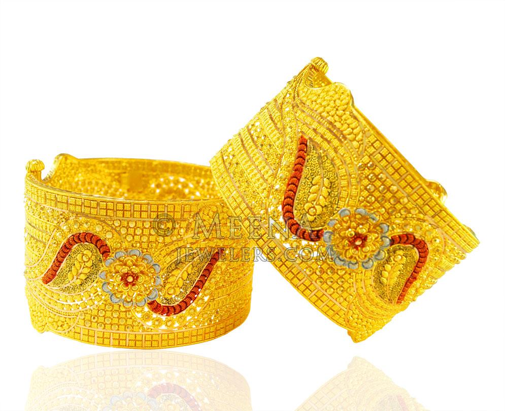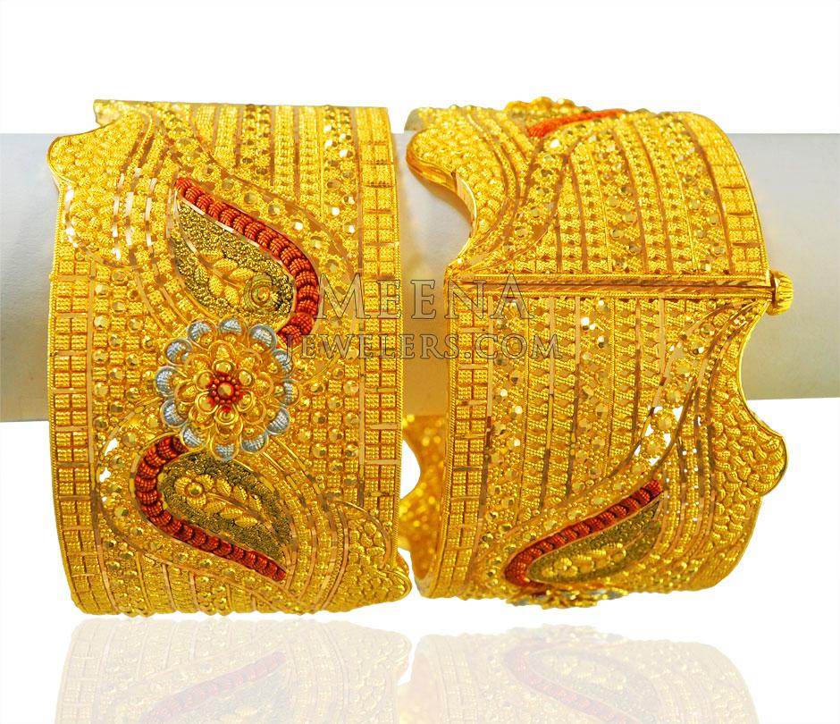 22K Gold Wide Tri Color Kada (2pcs). Kadas are handcrafted with fine filigree work in combination with Machine cut work. Three tone color work gives traditional look to it.