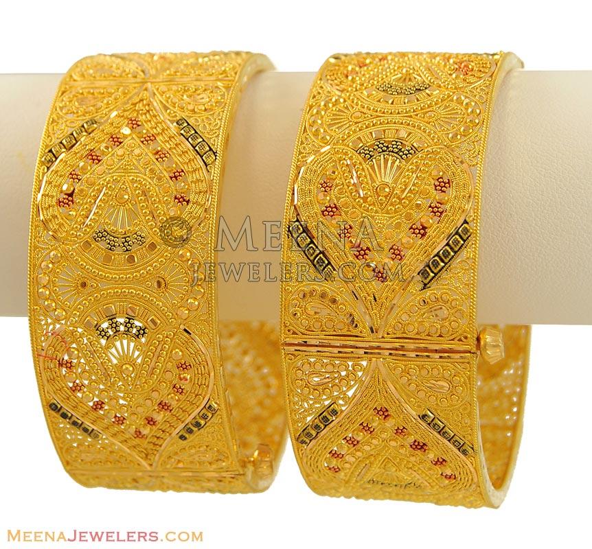 22k gold wide kadas (2 pcs), designed beautifully with filigree design in high shine frosty finish with tricolor combination