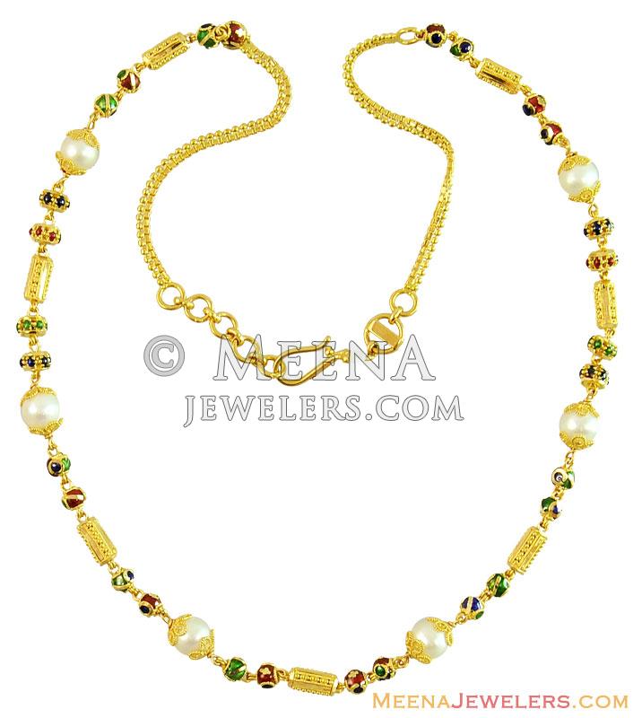 22k Gold Ladies Fancy Chain designed with gold balls, and gold cylinders teemed together in combination with pearl beads finished with handcrafted meenakari color work. Chain is designed in an alternative fashion with pearls and gold balls.