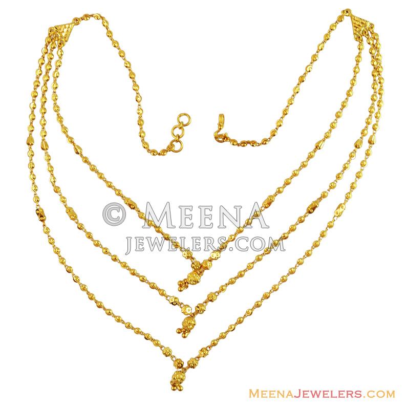 22Kt Gold Fancy Ladies 3 Layered Chain with gold balls teemed together with machine cuts in shine finish.