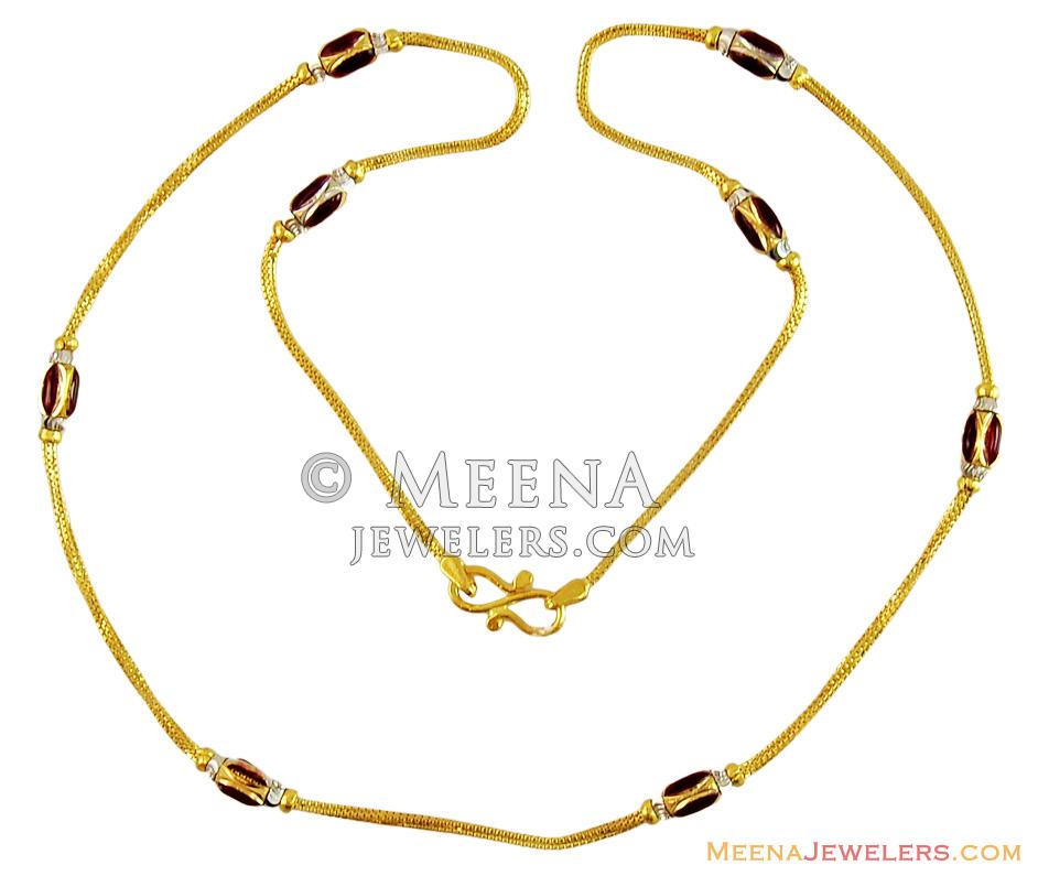 22Kt Gold Fancy Ladies Chain teemed together with gold balls in an alternative fashion finished with meena red color work and 2 tone rhodium work in shine finish.