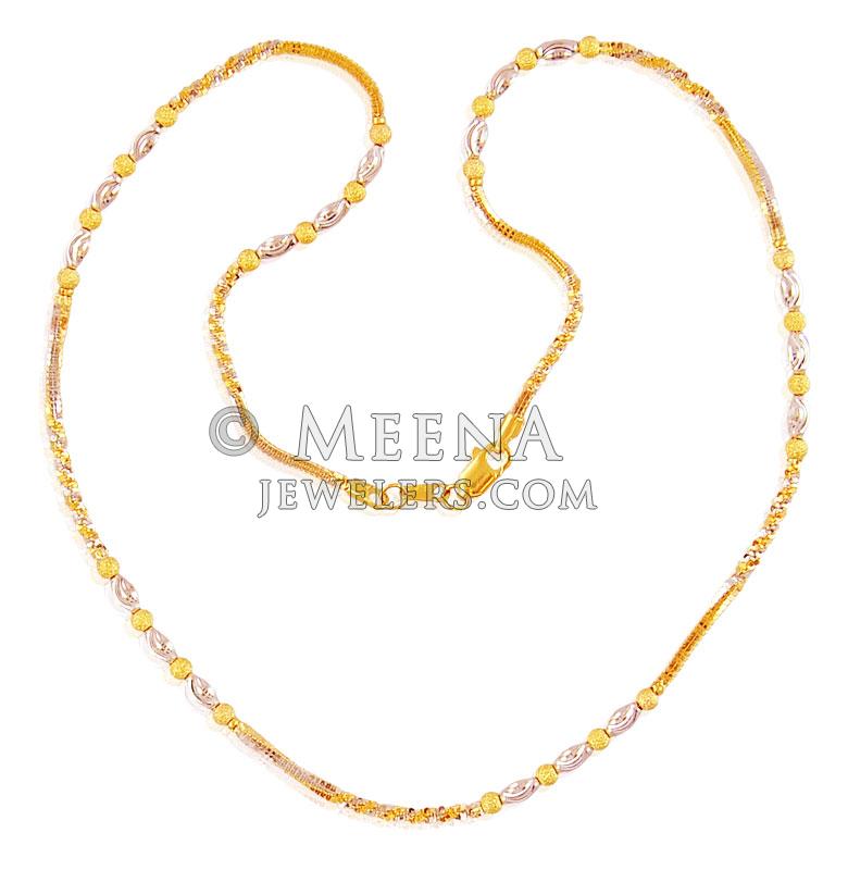 22K Gold designer chain for ladies. Chain is excellently designed with beaded gold balls set in an alternative pattern with two tone rhodium finish and frost finish.