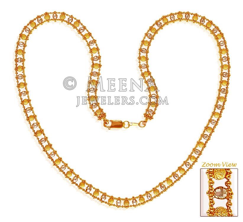 22K Gold chain is brilliantly designed with beaded Gold balls in between two chain. Two tone rhodium finish and frost finish enhances its beauty.