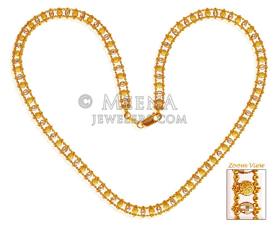 22K Gold chain is excellently handcrafted with beaded Gold balls in between two chain. Two tone rhodium finish and frost finish enhances its beauty.