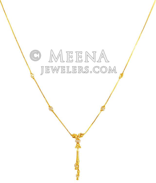 22Kt Gold Dokia style chain. Chain is designed with gold balls teamed together at the center with hanging chains. Laser cuts with two tone rhodium finish enhances its look.