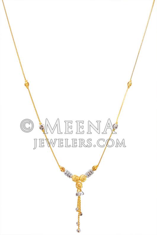 22K Gold Two Tone Fancy Chain is designed in Dokia style with beaded gold balls teamed together in the center.Laser cuts adds shine to it. Hanging gold balls enhances its look.