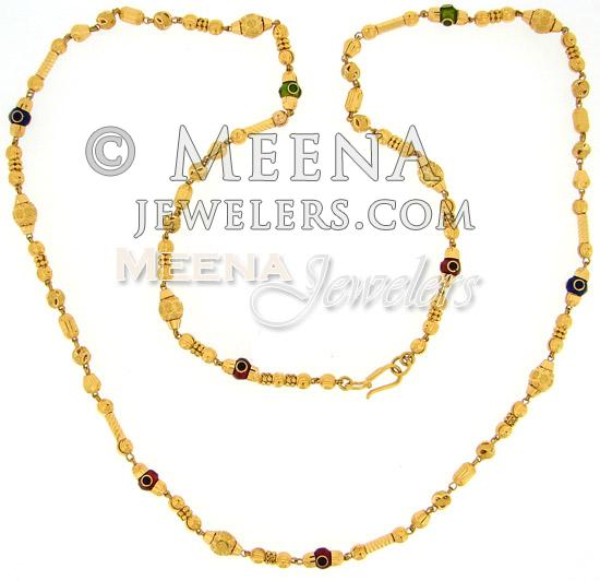 22 Kt Gold Long Chain with Meenakari. This chain in handmade and looks like a flower garland. The exquisite Meenakari on the balls and the Handmade design combination gives it a very Indian Jewelry look and is is liked by Indian Women.