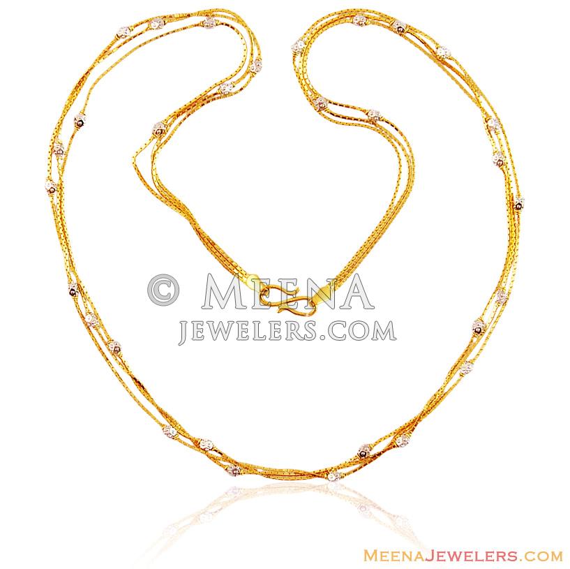 22K Gold Ladies Long Fancy Chain designed with three small chains intertwined together in combination with two tone rhodium finished gold balls teemed together for a class look.