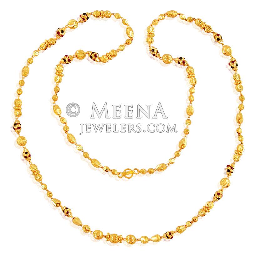 22K Gold Long Chain designed with beaded gold balls in an alternative pattern. Chain is finished with machine cuts and meenakari color work (Red and Green Color).