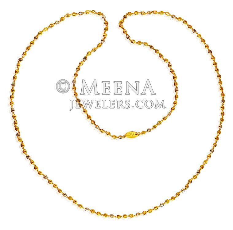 22kt fancy gold chain is excellently beaded with gold balls in two tone rhodium polish. Chain is finished with fine machine cuts.