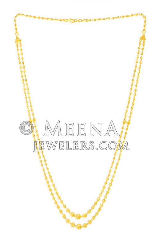 22Kt Gold Two Layers Long Chain for ladies. Chain is designed in two layers style with beaded gold balls and gold pipes with machine cuts. Diamond cuts in the center gold balls and shine finish adds beauty to it.