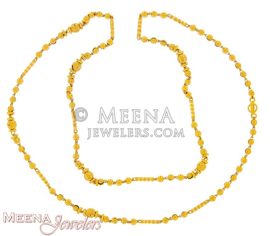 22Kt gold long ladies chain with gold balls and diamond cuts. The chain has gold cylinders and balls joined with strong chain ends.