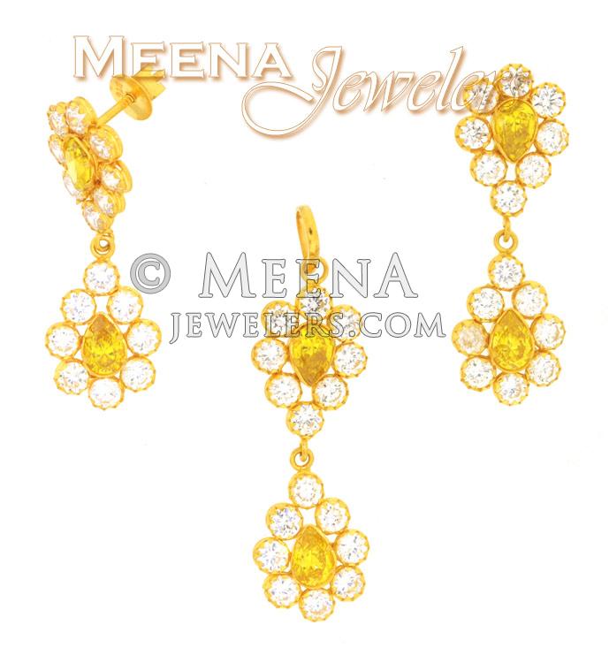 22kt Gold Pendant and Earrings Set with Cubic Zircon and Yellow Colored Tourmaline Studded on the Surface.