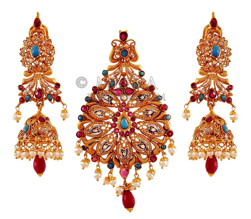 22k Gold Pendant and earrings set. Pendant set is exclusive designed with skilled craftsmanship in antique finish. Studded Turquoise, Ruby and Cubic Zircon with Ruby tear drop enhances its look.
