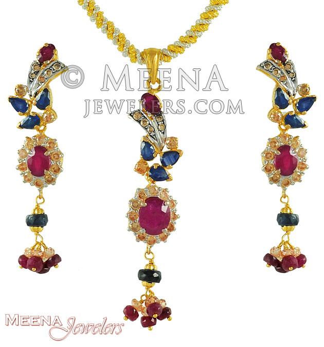 Gold pendant Set with Ruby and Sapphire ( Precious Stone Pendant Sets )