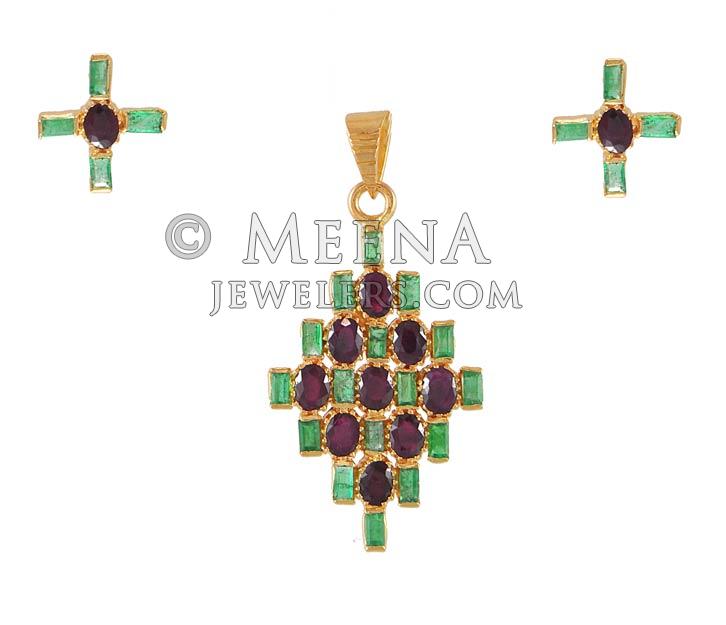 22 Kt Gold Ruby Emerald Pendant Set ( Precious Stone Pendant Sets )