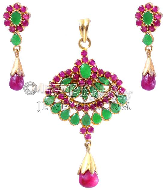 22Kt Gold Emerald, Ruby Pendant Set ( Precious Stone Pendant Sets )