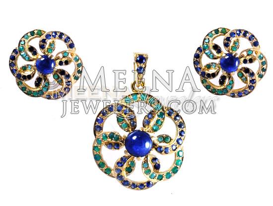 22Kt Gold Blue Sapphire, Emerald Pendant Set ( Precious Stone Pendant Sets )