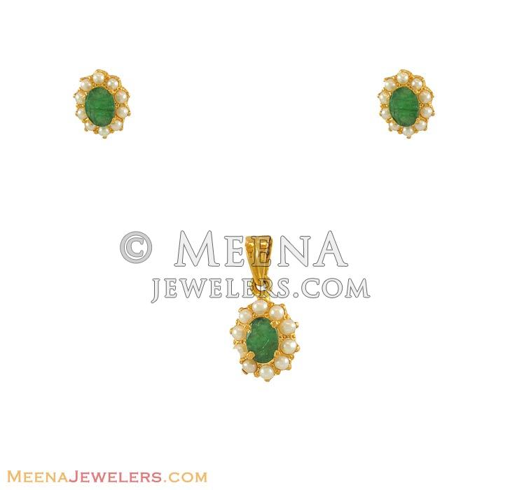 Gold Pendant Set with Emeralds and Pearls ( Precious Stone Pendant Sets )