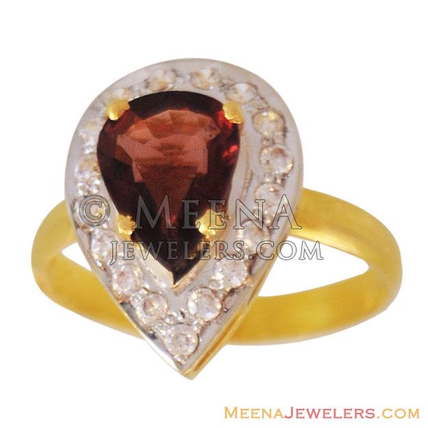 22Kt Gold Ring studded with brown colored stone in the center and cubic zircons around it. The ring is made in the Tear Drop style.