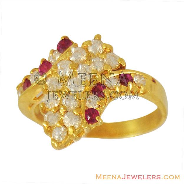 22Kt gold fancy ring studded with red colored stones and cubic zircons.