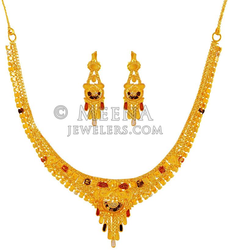 22k gold necklace and earrings set. Set is traditionally designed with three tone color work in combination with machine cuts and matte finish. It's a light construction set which has a wide design with less use of gold.